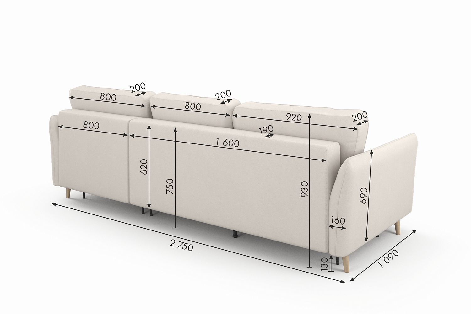 - Длина дивана: 275 см;