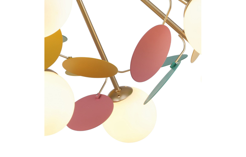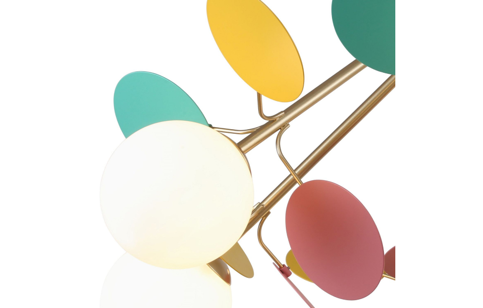 Multi Bliss поражает своим буйством красок и контрастом. Светильники из коллекции Multy Bliss чаще всего используют для детских комнат, чтобы создать уютную и игривую атмосферу. Декоративные круглые разноцветные пластины люстры и бра создают яркий и эффектный акцент в интерьере, придавая ему оригинальность и индивидуальность. Металлический каркас золотого цвета, круглые стеклянные плафоны молочного цвета, декоративные круглые разноцветные пластины, декоративные золотые шары, регулируемая высота.