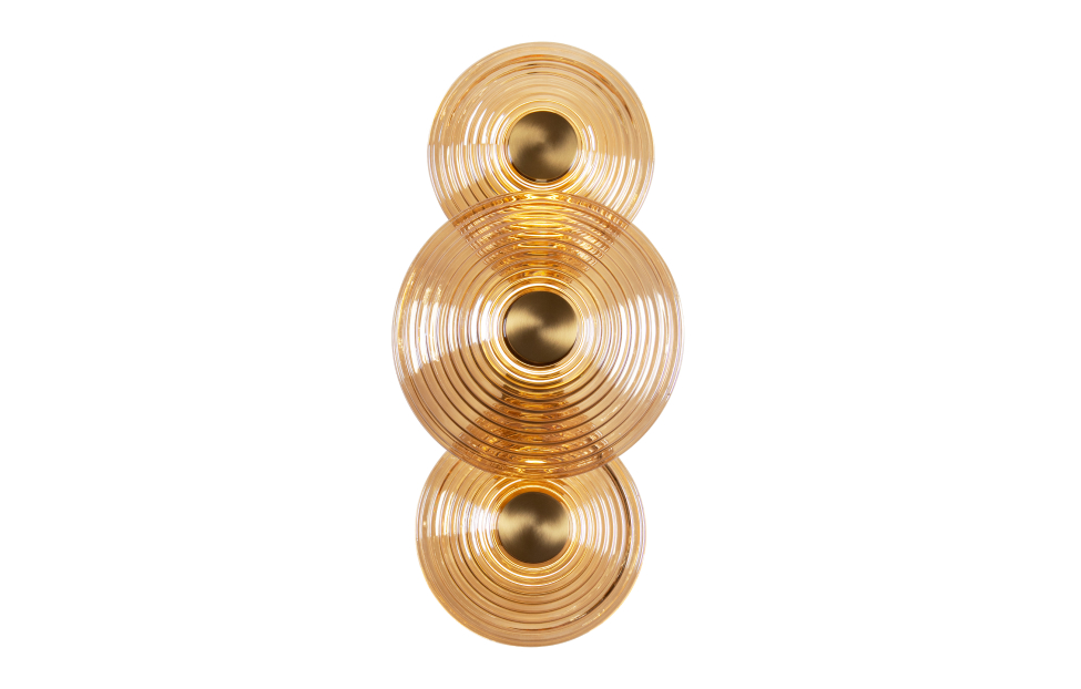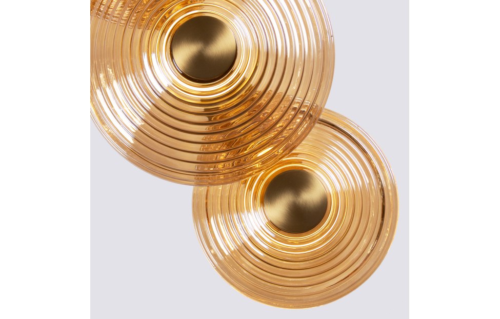 Светильники Whirlpool представляют собой современные элементы освещения с каркасом цвета латуни. Свет от встроенных LED-модулей создает впечатляющий эффект: он расходится внутри плафона, создавая игры света и теней. Этот эффект добавляет атмосферности и загадочности в помещение, делая освещение коллекции Whirlpool функциональным и художественным. Металлический каркас в цвете латунь, плафоны из стекла янтарного цвета с объемной структурой колец, встроенный LED-модуль.