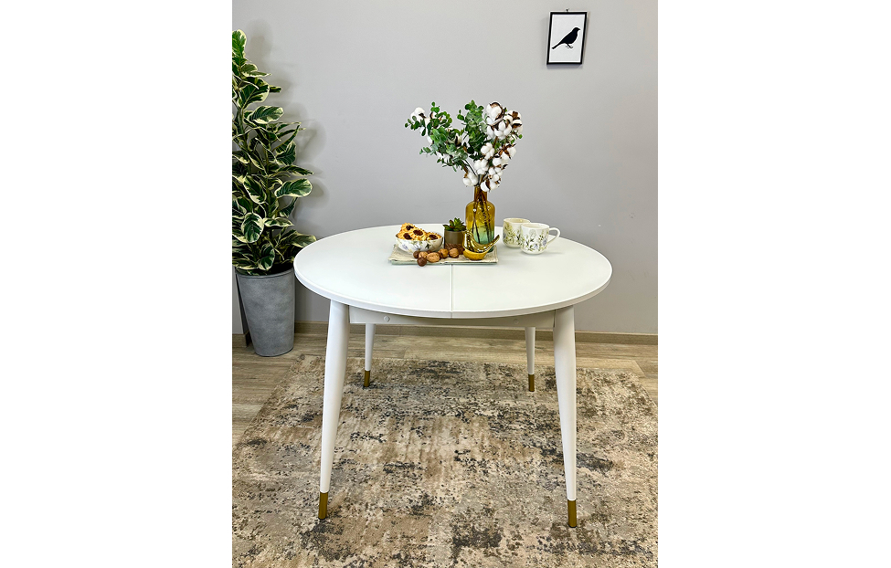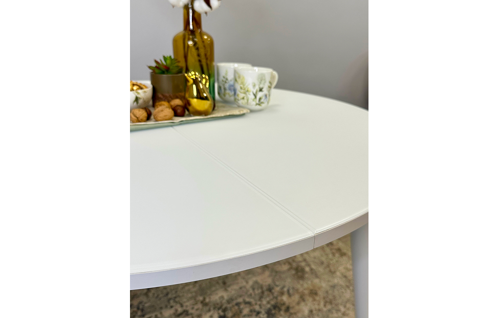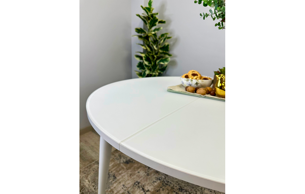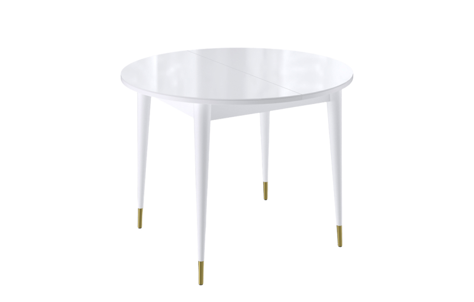 Стол обеденный Мане круглый раздвижной К1000 опоры белые с металлическими наконечниками, столешница - стекло белое глянец.