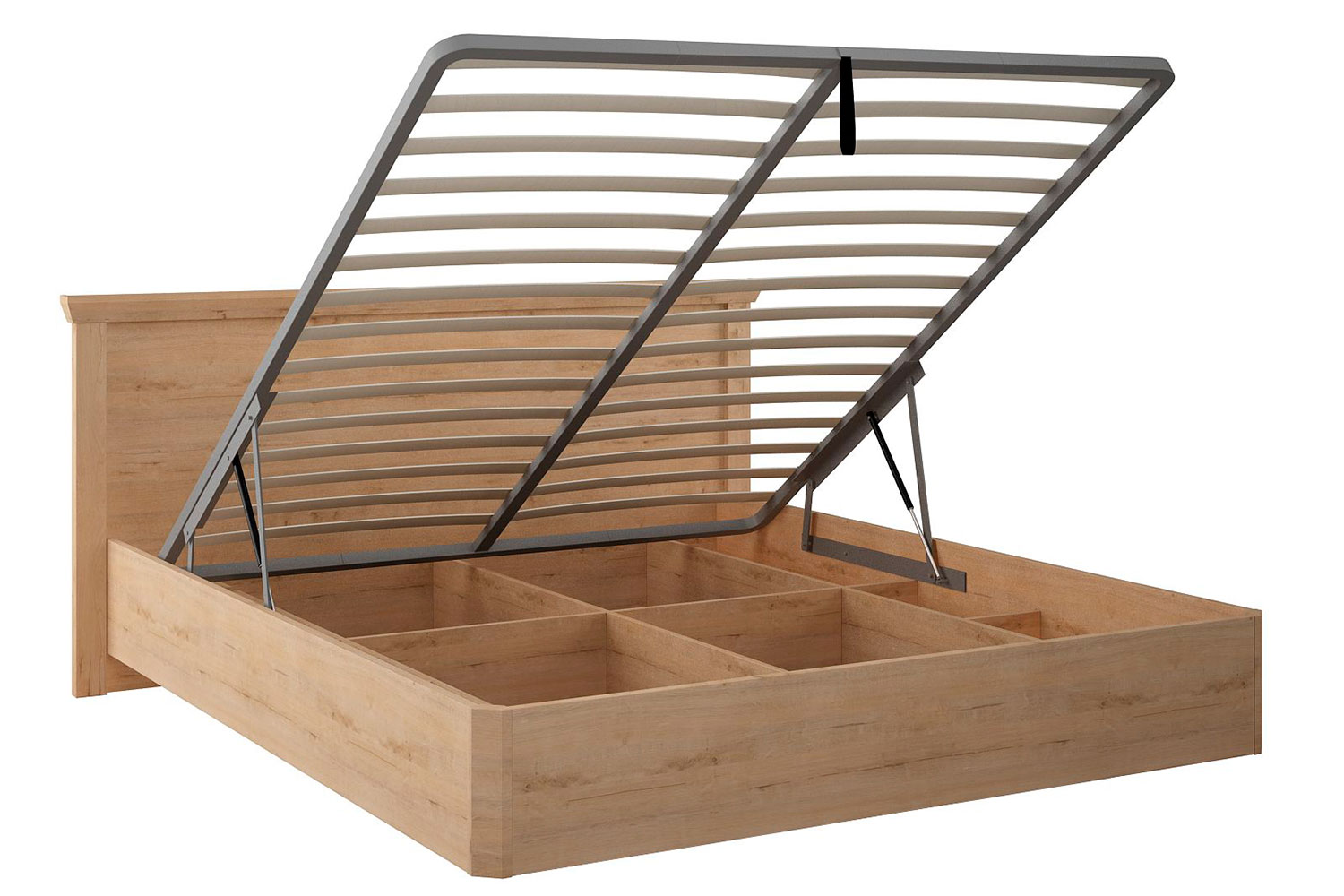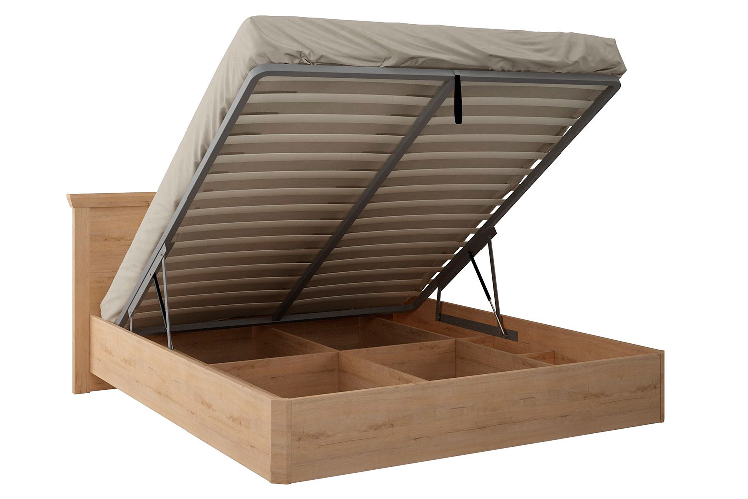 Двуспальная кровать снабжена удобным подъемным механизмом и встроенным, разделенным на разнородные секции, бельевым ящиком. Надежная конструкция, ортопедические ламели из березовой фанеры обеспечивают полный комфорт во время сна.