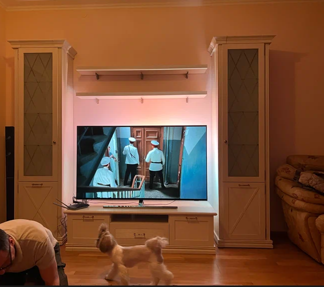 - В гостиной есть вся необходимая мебель для хранения: два напольных шкафа, большая тумба сразу с тремя отделениями и две полки. Для самого важного всегда найдется место;